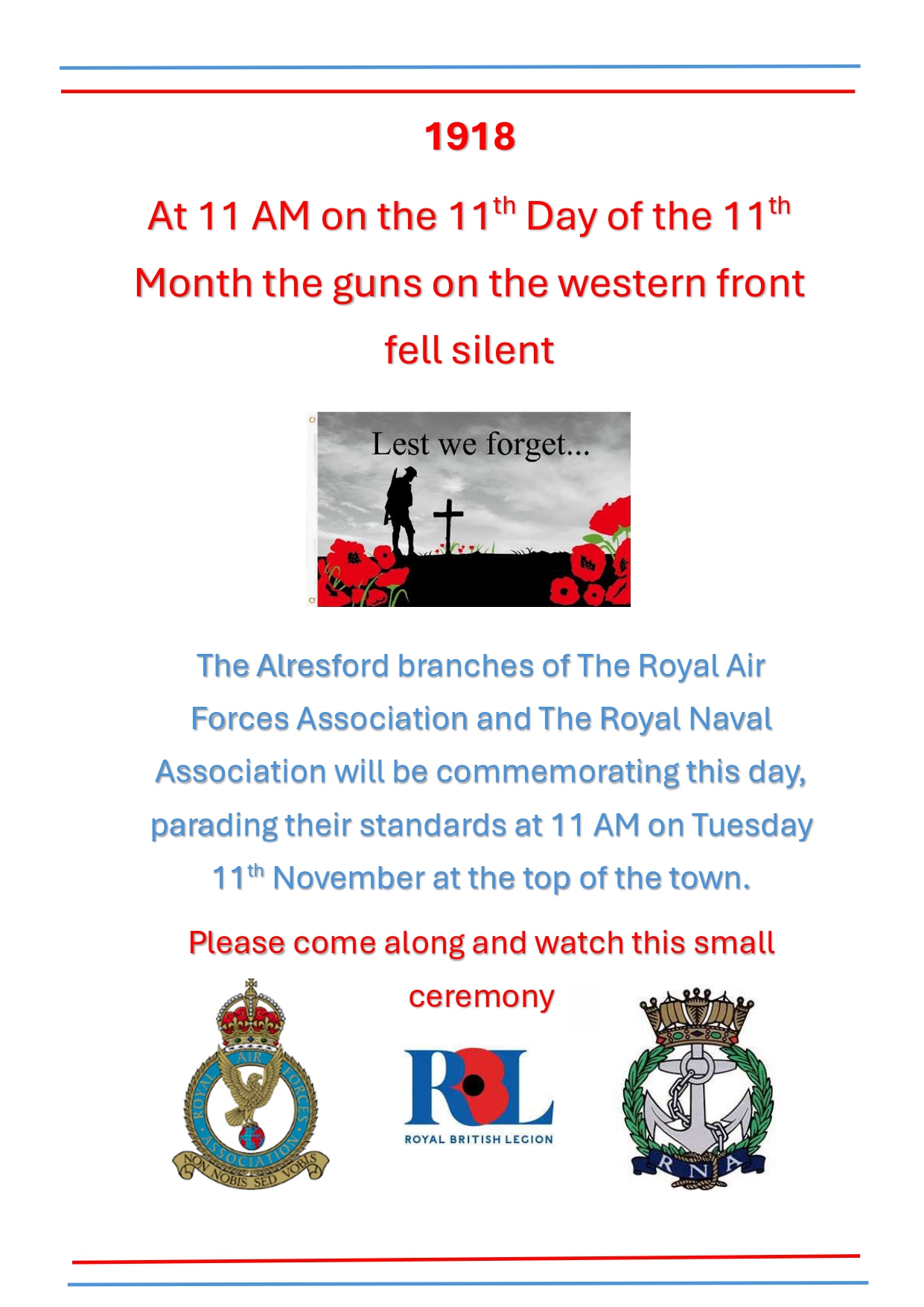 Remembrance Parade in Alresford Tuesday 11th November, at 11am